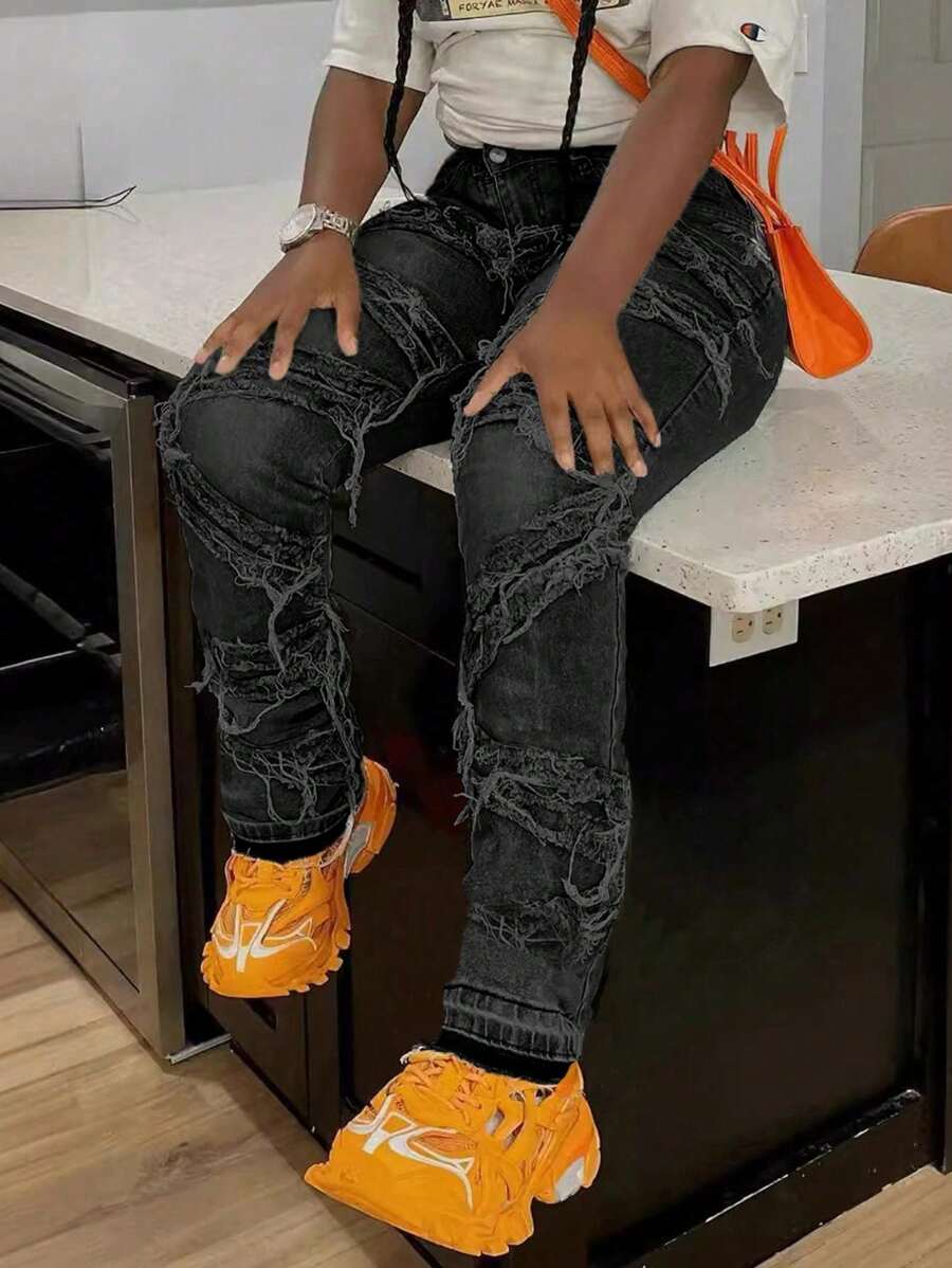 Jeans casuales para mujer con estilo Y2K, ropa de calle de los 90, bolsillos en diagonal, alta elasticidad, desgastados, deshilachados, con flecos únicos, pantalones vaqueros de estilo hip hop