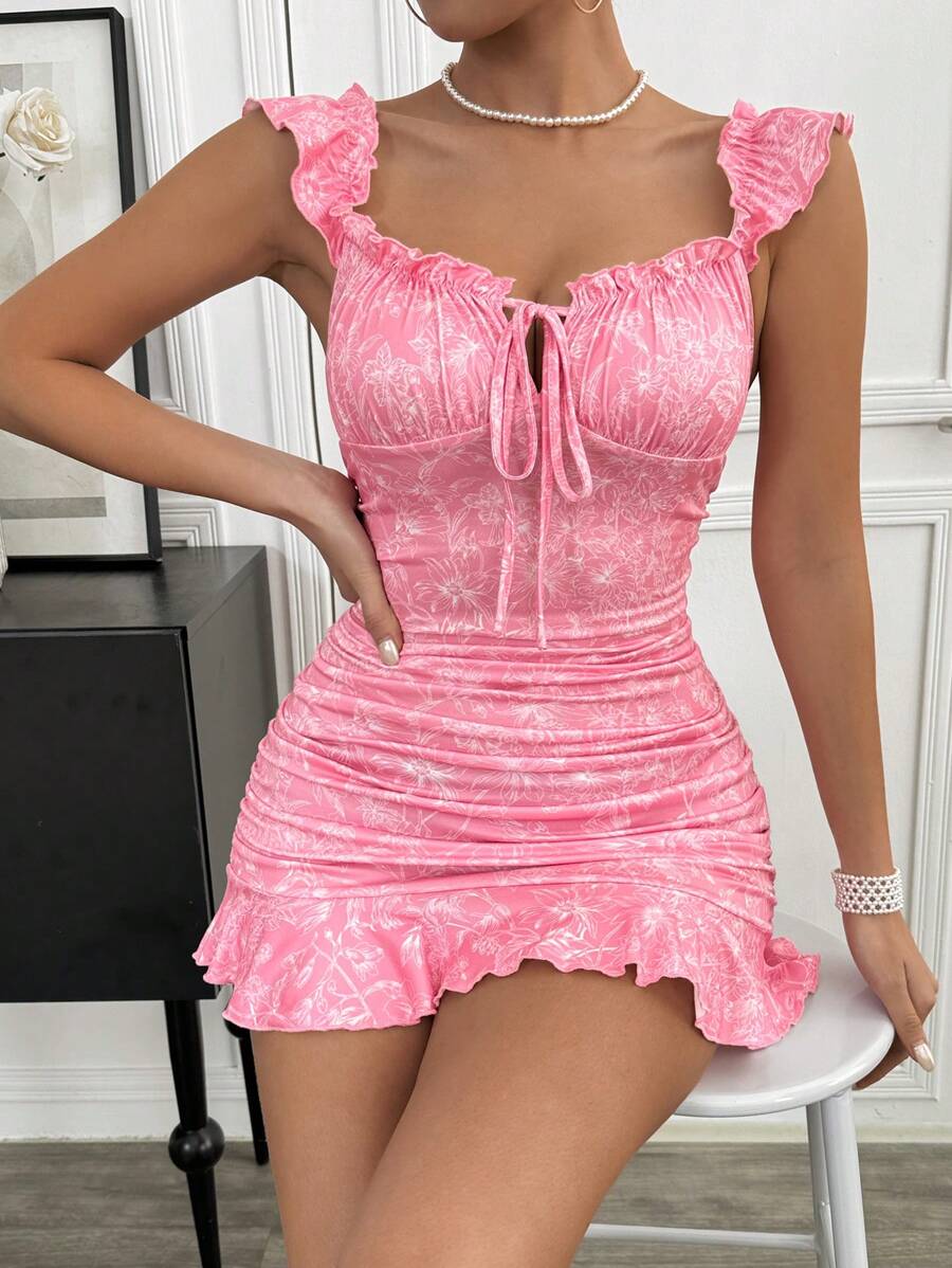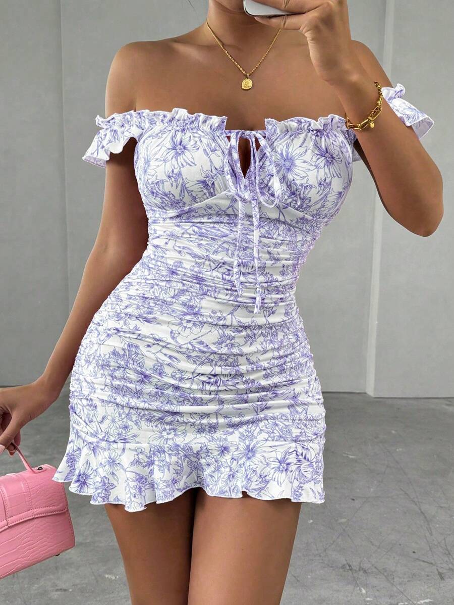 VaVaBold Vestido elegante con estampado floral, volante en el bajo, amarrado al frente, hombros descubiertos, para vacaciones y playa de mujeres